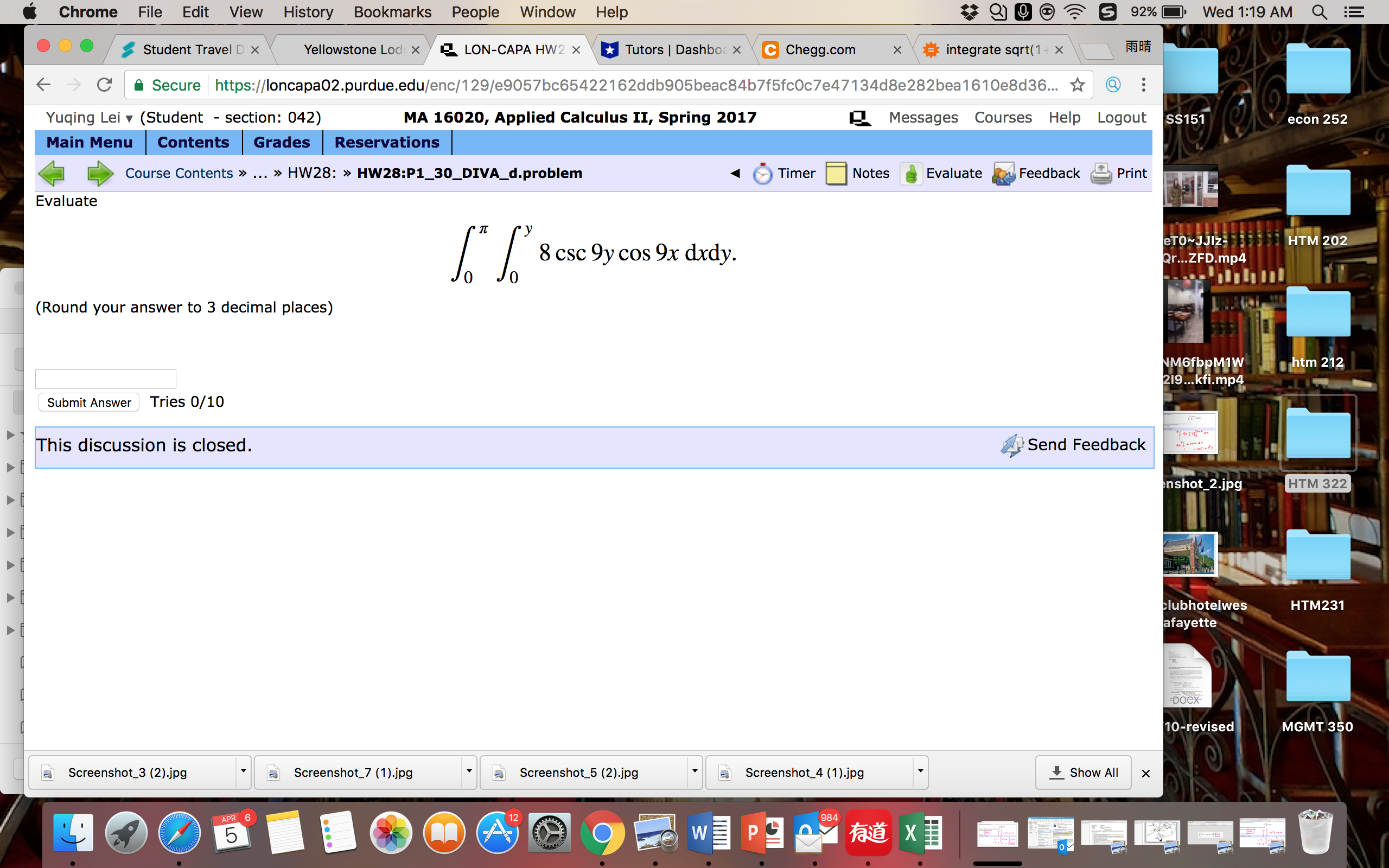 l 2l9mkfiimp4 Submit Answer Tries 0/10 (Round your answer to 3 decimal places) 7 This discussion is closed. fluSend Feedback nshot_2.jpg lubhotelwes 'lO-revised MGMT 350 " a ScreenshoL7(1).jpg a ScreenshoL5(2).ipg '[ 3 ScreenshoL4(‘|).jpg ishowAll x