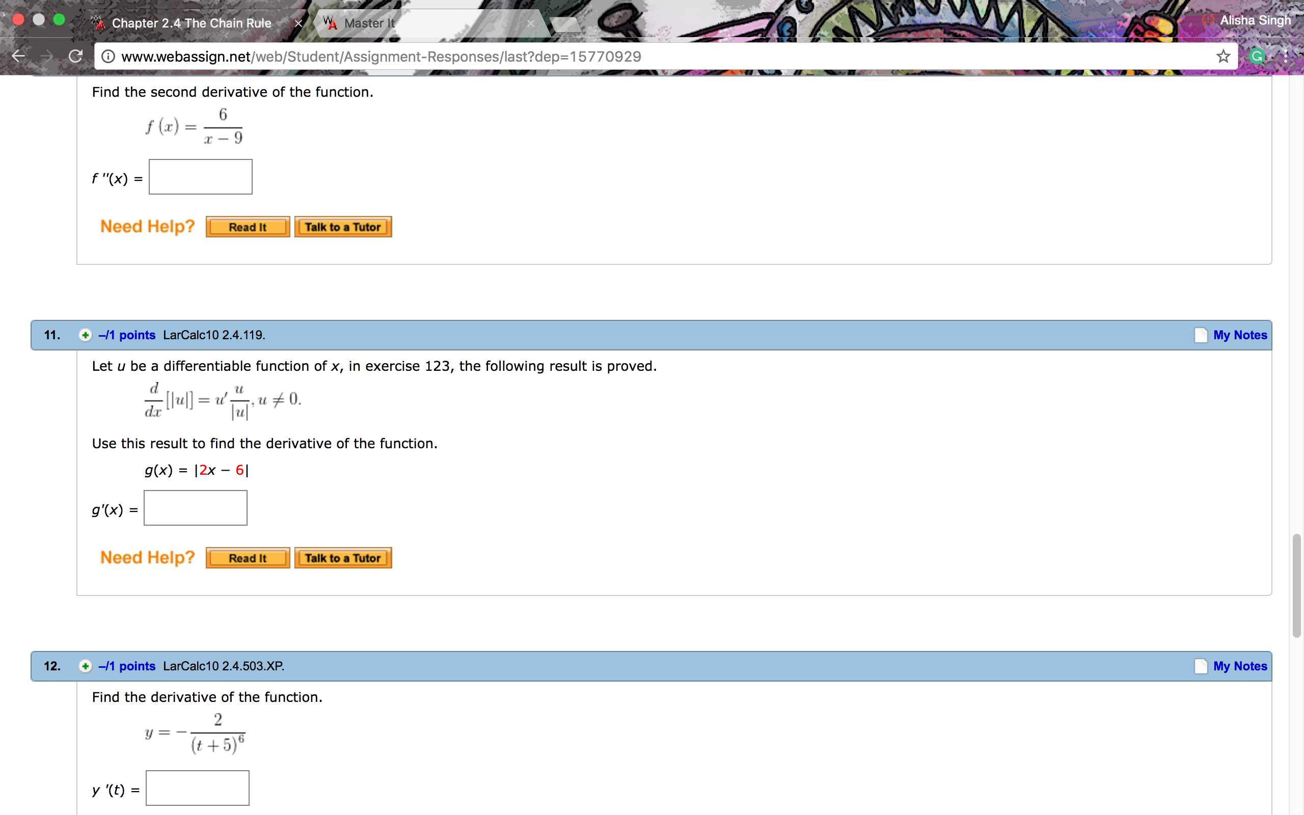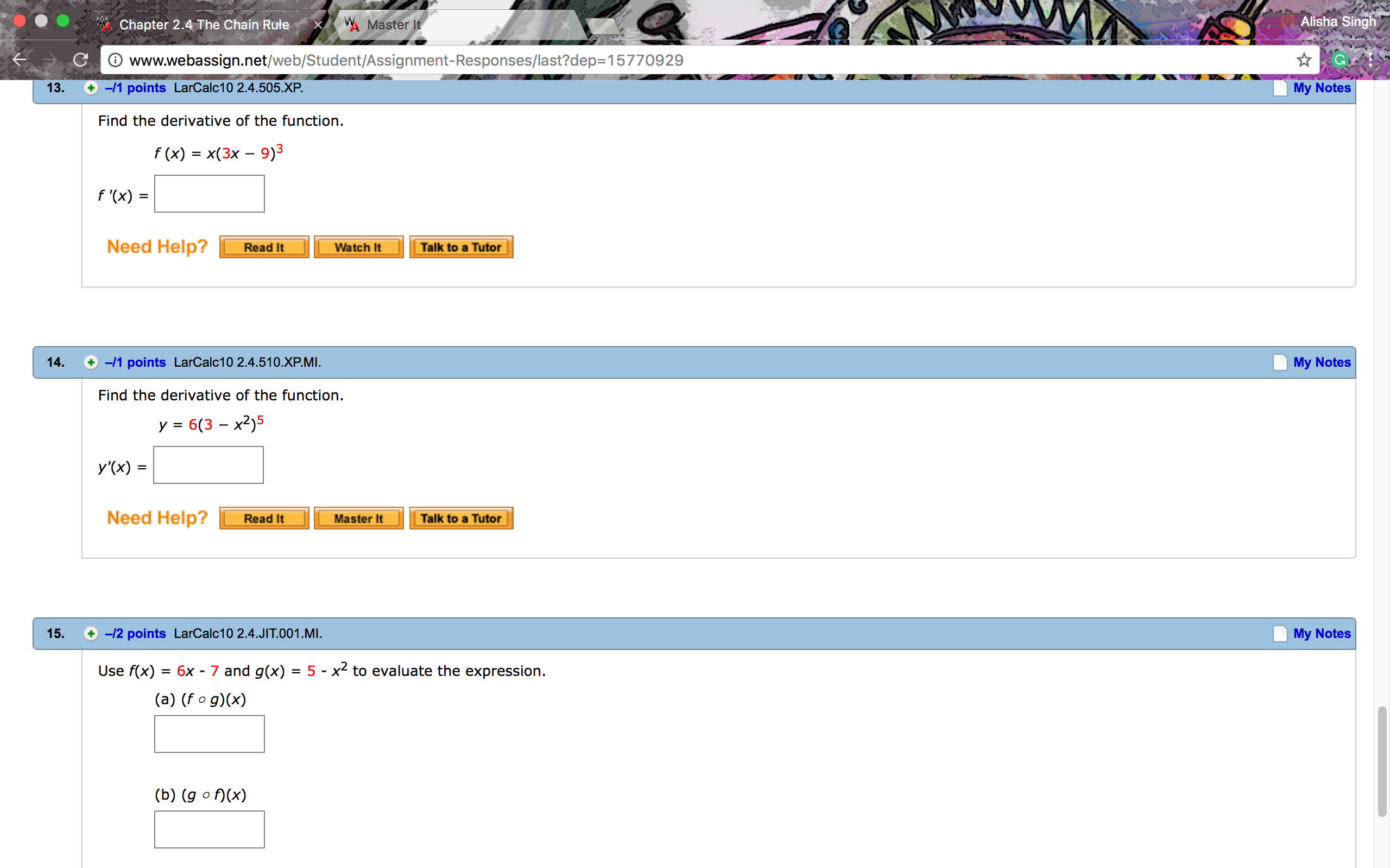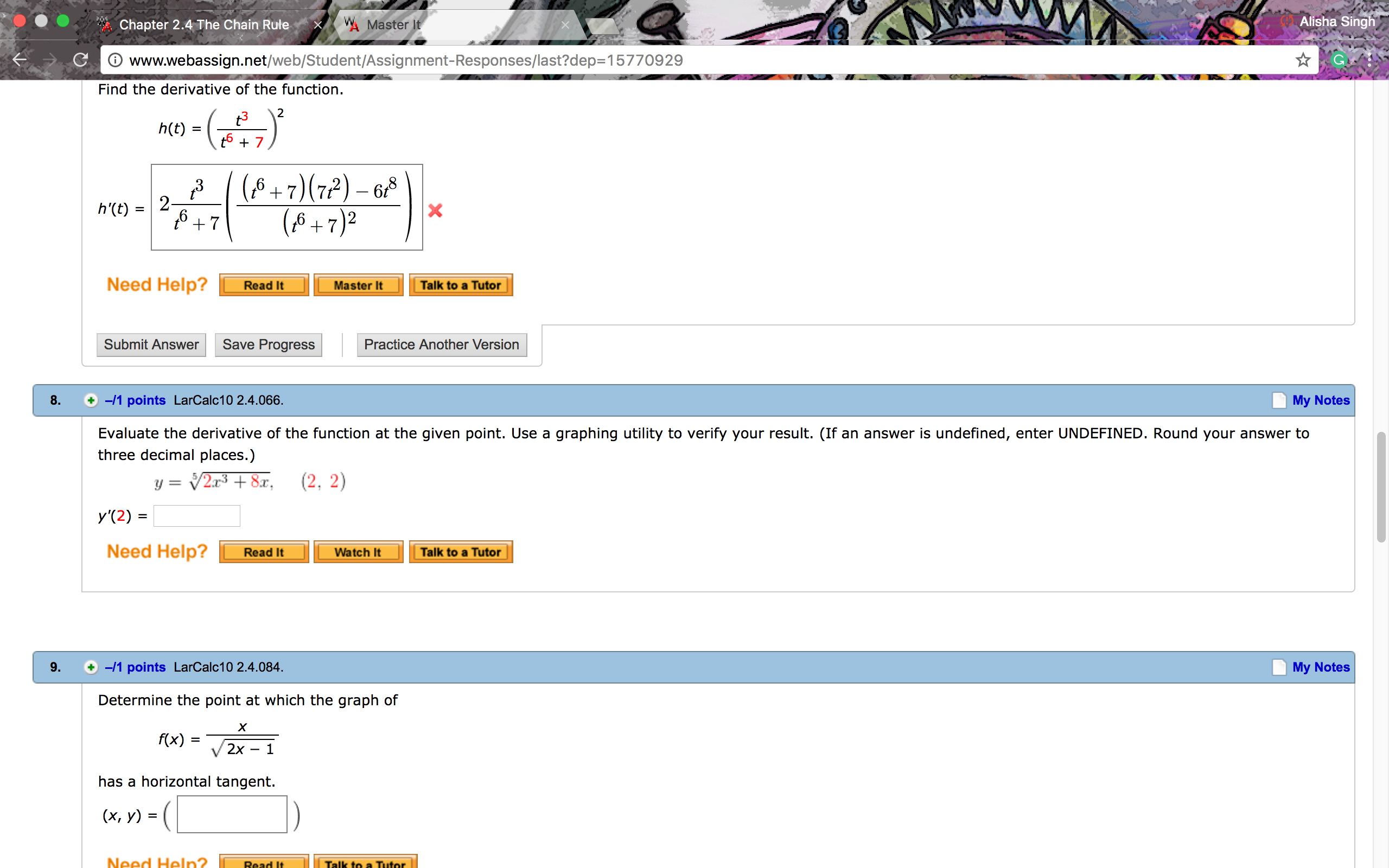 Chapter 2.4 The Chain Rule i‘ ' i . " Alisha Singh 6 C‘ (Dwww.webassign.net/web/Student/Assignment-Responses/last?dep=15770929 i} G 5 Find the derivative of the function. _ :3 2