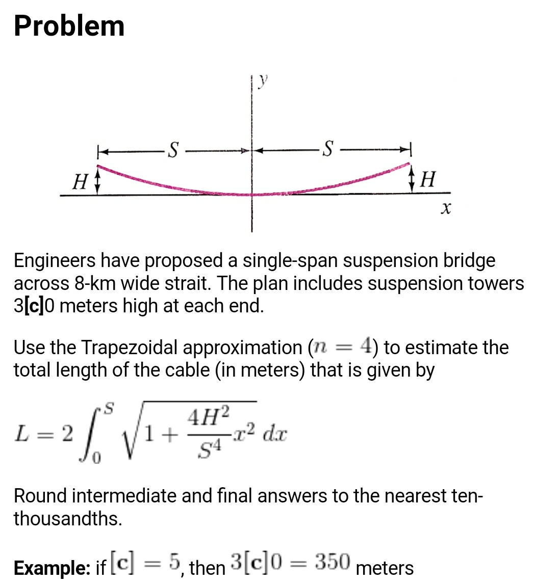 3[c]0 meters high at each end. Use the Trapezoidal approximation (n = 4) to estimate the