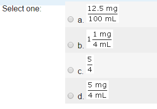 22. Â A solution for a dental technology lab is made of 12.5 mg of an active ingredient and 10 mL of a solvent. What is the rate of active ingredient to solvent?