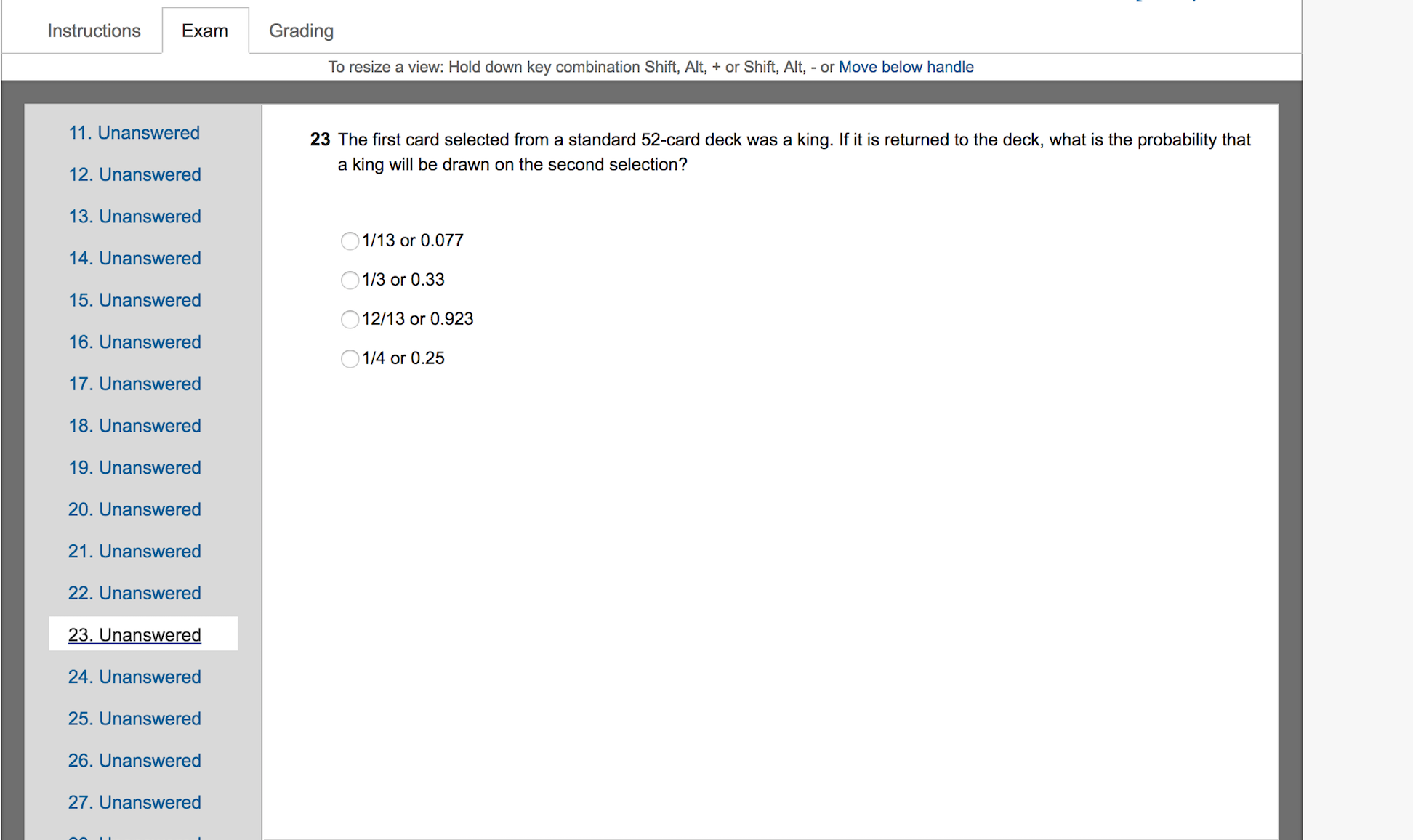 Instructions Exam Grading To resize a view: Hold down key combination Shift, Alt, + or Shift, Alt. - or Move beiow handle 11' unanswered 23 The first card selected from a standard 52-card deck was a king. If it is returned to the deck, what is the probability that - - ' '2