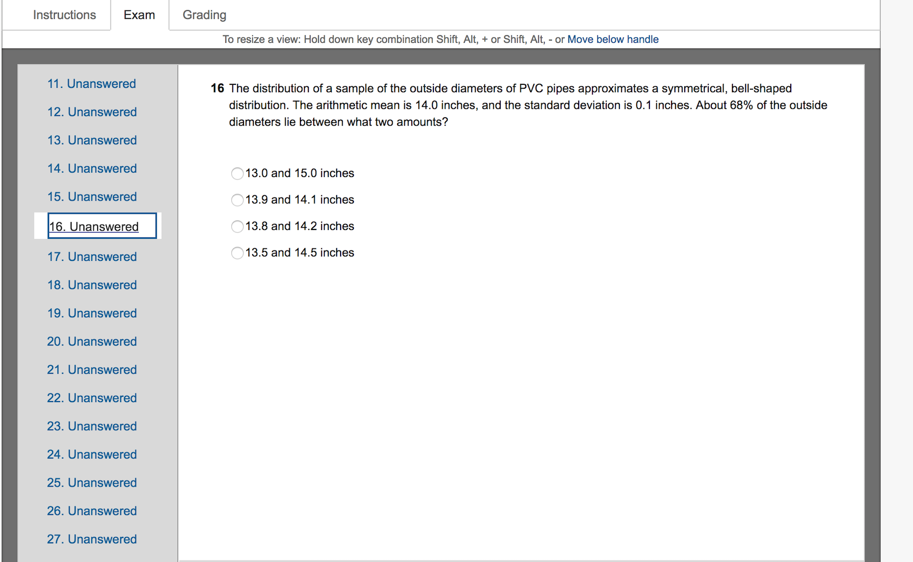 Instructions ‘ Exam ‘ Grading To resize a View: Hold down key combination Shift, Alt, + or Shift, Ail, - or Move beiow handle 11' unanswered 16 The distribution of a sample of the outside diameters of PVC pipes approximates a symmetrical. bell-shaped