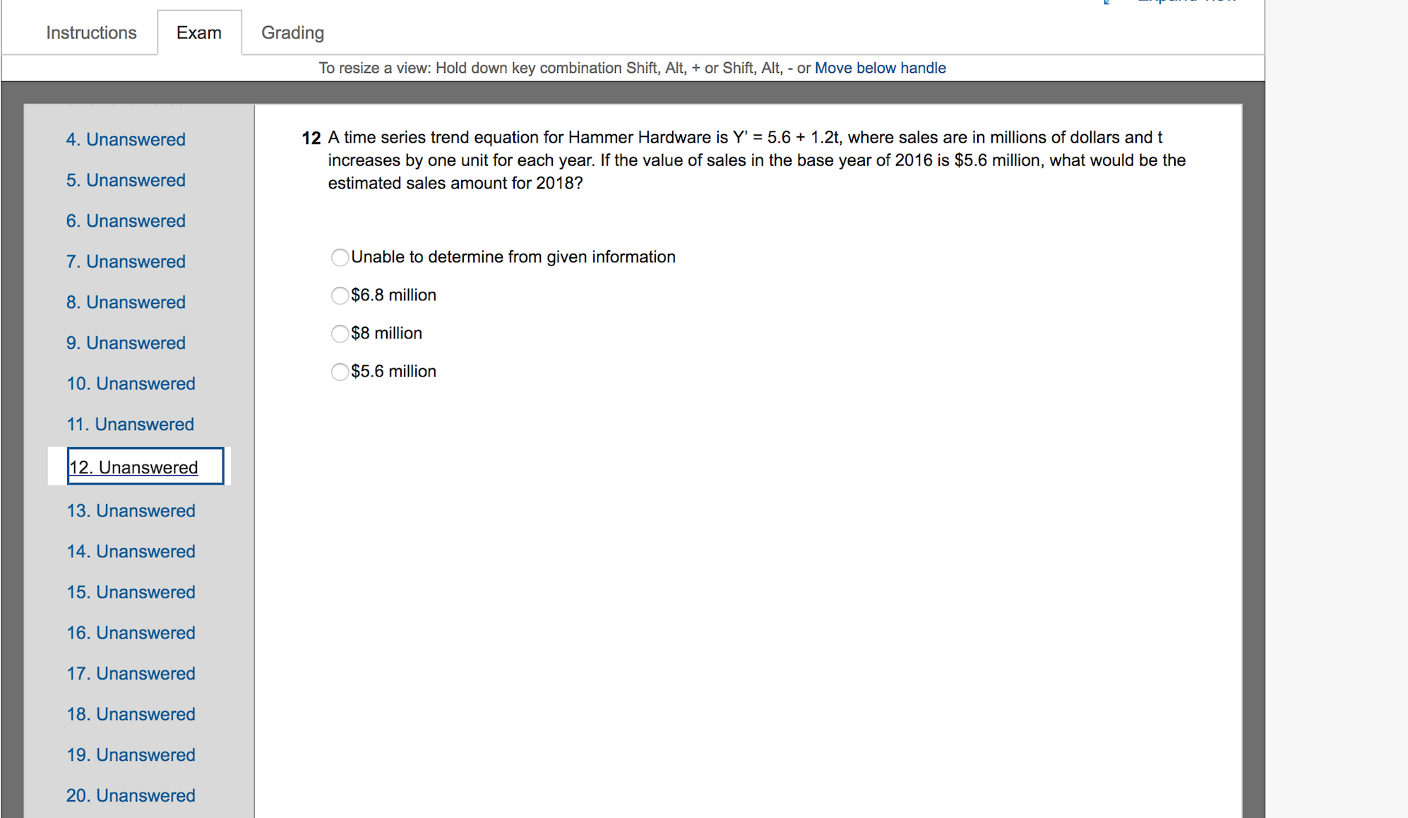 Instructions Exam Grading To resize a view: Hold down key combination Shift, Alt, + or Shifl, AEt, - or Move below handle 4. Unanswered 12 A time series trend equation for Hammer Hardware is Y' = 5.6 + 1.2t, where sales are in millions of dollars and t