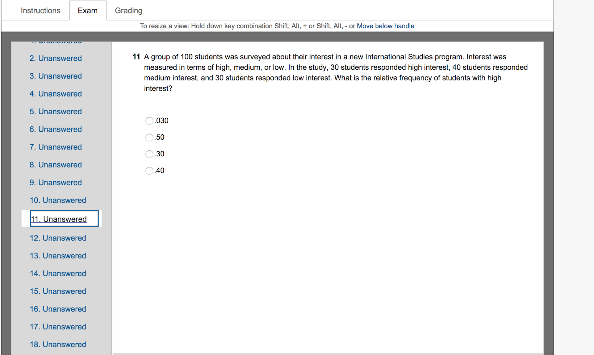 Instructions Exam Grading To resize a view: Hold down key combination Shift, Alt, + or Shift, Alt, - or Move below handle 2_ Unanswered 11 A group of 100 students was surveyed about their interest in a new International Studies program. Interest was