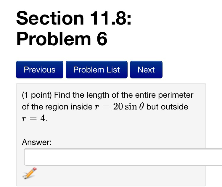 Problem 6 (1 point) Find the length of the entire perimeter of the region inside 5" = 20 sin 6 but outside