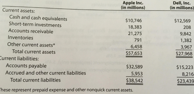 The current assets and current liabilities for Apple Inc. and Dell, Inc., are shown as follows at the end of a recent fiscal period: