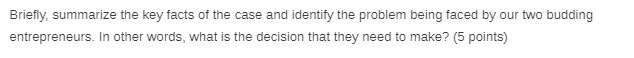 Briefly. summarize the key facts of the case and identify the problem being faced by our two budding entrepreneurs. In other words. what is the decision that they need to make? (5 points)Â