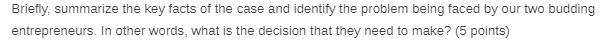 Briefly. summarize the key facts of the case and identify the problem being faced by our two budding entrepreneurs. In other words. what is the decision that they need to make? (5 points)Â