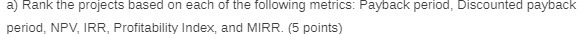 a) Rankthe projects based on each of the following metrics: Payback period.