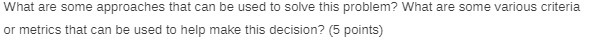 What are some approaches that can be used to solve this problem? What are some various criteria or metrics that can be used to help make this decision? (5 points)Â