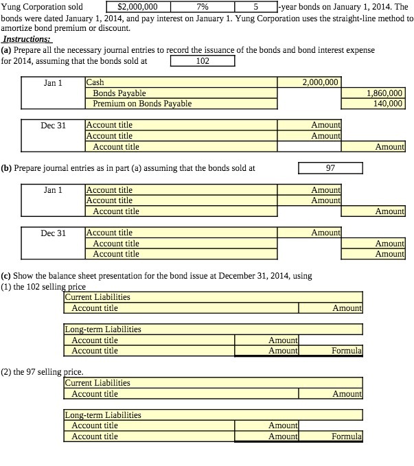 Yung Corporation sold I $2,000,000 I 7% I 5 I-year bonds on January 1, 2014. The bonds were dated January 1, 2014, and pay interest on January 1. Yung Corporation uses the straight-line method to amortize bond premium or discount. Instructions: (a) Prepare all the necessary journal entries to record the issuance of the bonds and bond interest expense for 2014, assuming that the bonds sold at 102 Jan 1 Cash 2,000,000 Bonds Payable 1,860,000 Premium on Bonds Payable 140,000 Dec 31 Account title Amount Account title Amount Account title AmountI (b) Prepare journal entries as in part (a) assuming that the bonds sold at J an 1 Account title Amount Account title Amount Account title AmountI Dec 31 Account title Amount Account title Amount Account title Amount (c) Show the balance sheet presentation for the bond issue at December 31, 2014, using (1) the 102 selljn .price Current Liabilities Account title I Amount L ong-term Liabilities I Account title Amount Account title Amount Formulal (2) the 97 selling rice. Current Liabilities Account title I Amount L ong-term Liabilities I Account title Amount Account title Amount FormulalÂ