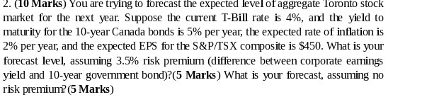 2. (10 Marks) You are trying to forecast the expected level of aggregate Toronto stock market for the next year. Suppose the current T—Bill rate is 4%, and the yield to maturity for the 10-year Canada bonds is 5% per year, the expected rate of inflation is 2% per year, and the expected EPS for the S&P/TSX composite is $450. What is your forecast level, assuming 3.5% risk premium (difference between corporate earnings yield and 10-year government bond)?(5 Marks) What is your forecast, assuming no risk premium?(5 Marks)Â