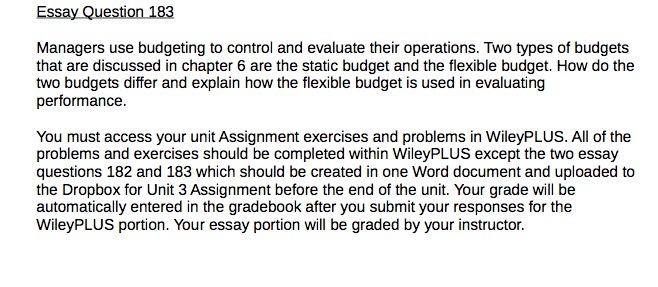 Essay Question 183 Managers use budgeting to control and evaluate their operations. Two types of budgets that are discussed in chapter 6 are the static budget and the flexible budget. How do the two budgets differ and explain how the flexible budget is used in evaluating performance. You must access your unit Assignment exercises and problems in WileyPLUS. All of the problems and exercises should be completed within WileyPLUS except the two essay questions 182 and 183 which should be created in one Word document and uploaded to the Dropbox for Unit 3 Assignment before the end of the unit. Your grade will be automatically entered in the gradebook after you submit your responses for the WileyPLUS portion. Your essay portion will be graded by your instructor.Â