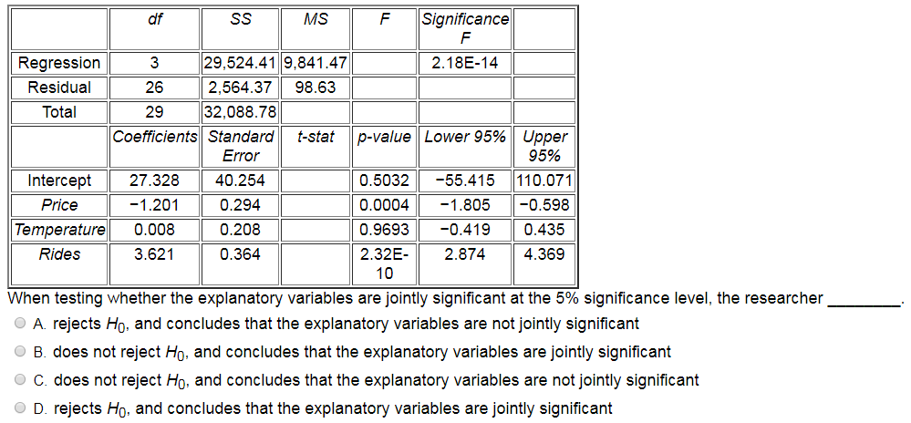 A researcher analyzes the factors that may influence amusement park attendance. She estimates the following model:Attendance = β0 + β1Price + β2Temperature + β3Rides + ε, where Attendanceis the daily attendance (in 1,000s), Price is the gate price (in $), Temperature is the average daily temperature (in °F), and Rides is the number of rides at the amusement park. A portion of the regression results is shown in the accompanying table.