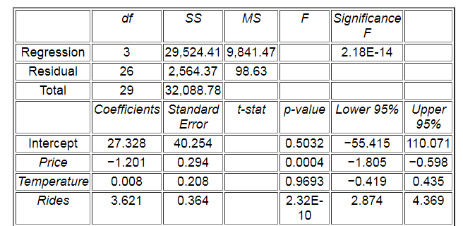 A researcher analyzes the factors that may influence amusement park attendance. She estimates the following model: Attendance = β0 + β1Price + β2Temperature + β3Rides + ε, where Attendanceis the daily attendance (in 1,000s), Price is the gate price (in $), Temperature is the average daily temperature (in °F), and Rides is the number of rides at the amusement park. A portion of the regression results is shown in the accompanying table.