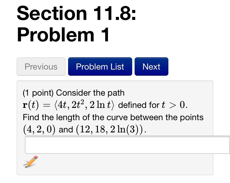 Consider the path r(t)=⟨4t,2t2,2lnt⟩ r(t)=(4t, 2t^2, 2 ln t) defined for t>0 Find the length of the curve between the points (4, 2, 0) and (12, 18, 2 ln (3)) The question is attached in the picture