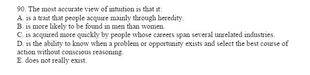 90. The most accurate View of intuition is that it: A. is a trait that people acquire mainly through heredity. B. is more likely to be found in men than women. C. is acquired more quickly by people whose careers span several unrelated industries. D. is the ability to know when a problem or opportunity exists and select the best course of action without conscious reasoning. E. does not really exist.Â
