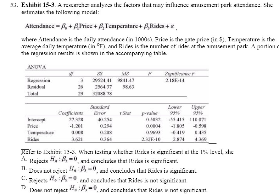53. Exhibit 15-3. A researcher analyzes the factors that may influence amusement park attendance. She estimates the following model: Attendance = .80 + [)IPricc + [IlTempcrature + [I‘Rides + s where Attendance is the daily attendance (in 1000s), Price is the gate price (in $), Temperature is the average daily temperature (in 0F), and Rides is the number of rides at the amusement park. A portion c the regression results is shown in the accompanying table. .\\‘( >\'.\ J!" SN 1/5 1" Signmcum‘c ! Regression 3 39524.“ "341.47 1. l tilt-l4 Rcmlllul 3(5 INN}? 98 ()3 Total 3‘) 13088 78 ShllJJru‘d' [JJH'CI‘ If k’Iii'I' f. '11..:,ffh.'h‘nl.\' lz'rrul' I Sm! [lamina 40% 05‘5“.) Intercept 37.328 40.254 0 5032 ~55.415 I [0.07] Price -| 20] (1.294 0 “(NH -I .8()5 41598 'l‘cmpcramrc (l (108 (I :08 0 960,1 -(l Jl‘) I) 435 Bi}??? 3.9-“ ‘.’.-.~_“A.(’3 3:5 .3}{ill—.3.-.§.7V4._i-f‘9f’_ REfer to Exhibit 15-3. When testing whether Rides is significant at the 1% level, she A' Rejects H0 Zflfi = 0, and concludes that Rides is significant. 13' Does not reject H0 Zflfi = 0, and concludes that Rides is significant. C' Rejects H0 1% = 0, and concludes that Rides is not significant. D' Does not reject H0 I/IJ = 0, and concludes that Rides is not significant.