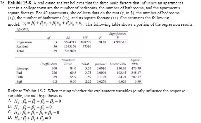 76. Exhibit 15-8. A real estate analyst believes that the three main factors that influence an apartment's rent in a college town are the number of bedrooms, the number of bathrooms, and the apartment's square footage. For 40 apartments, she collects data on the rent (y, in $), the number of bedrooms (x1), the number of bathrooms (x2), and its square footage (x3). She estimates the following model: -".- = #0 + flr‘i: + flz-‘E‘ + flirts + 5:, . The following table shows a portion of the regression results. .\\( )\ .\ .\‘.vg»m.=.~..m. " .1! SS .‘n 15‘ I- 1' Regression 3 569-1717 1898239 50 88 4 ‘J‘JI‘I-IS Residual .10 l .14? I 76 R73 I U 'luml 5‘) 7037893 NmmiJru' Y' 11";701‘ ['.'n.'.‘,f.u.‘.u.‘lil.\ 1".‘rv'm' 1 Surf [Haulin- 1.mu‘r '15'247) ‘lfi'lc- lnlcrccpl Fl)“ 84 (l 3 57 0 0011,) I50 ()3 470.70 Bed 3% M) .1 ,1 1'5 H (mm, In} .15 UK I? llalh 8‘) 55,9 1 5‘) l) 1195 34.34 20177 Sq" 0 I 0.0" _’ I: H (1370 0014 0.5" Refer to Exhibit 15-7. When testing whether the explanatory variables jointly influence the response variable, the null hypothesis is A' Hoiflo=fl|=flz=fl1=0 B' [III:/}l=fll=/;J=O Hui/ifil’H/IH/ZFO H. c. D. :/2,+/1,+/2_,=o
