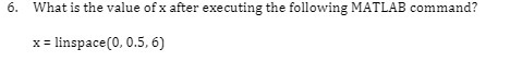 6. What is the value of x after executing the following MATLAB command? x = linspace(0, 0.5, 6) This text was automatically generated from the attachment. Please refer to the attachment to view this question. This question was created from Sample Final Exam Questions 15s https://www.coursehero.com/file/11587735/Sample-Final-Exam-Questions-15s/?focusQaId=10813219