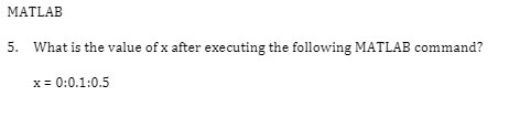 MATLAB 5. What is the value of x after executing the following MATLAB command? x = 0:0.1:0.5 This text was automatically generated from the attachment. Please refer to the attachment to view this question. This question was created from Sample Final Exam Questions 15s https://www.coursehero.com/file/11587735/Sample-Final-Exam-Questions-15s/?focusQaId=10813218