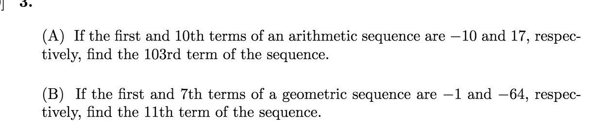 (A) If the first and 10th terms of an arithmetic sequence are —10 and 17, respec- tively, find the 103rd term of the sequence. (B) If the first and 7th terms of a geometric sequence are —1 and —64, respec- tively, find the 11th term of the sequence.