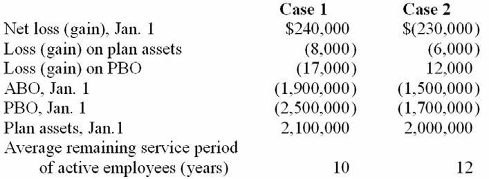 Vrable Corporation has a defined benefit pension plan. Two alternative possibilities for pension-related data for the current calendar year are shown below: Required: For each independent case, calculate amortization of the net loss or gain that should be included as a component of pension expense for the current year.