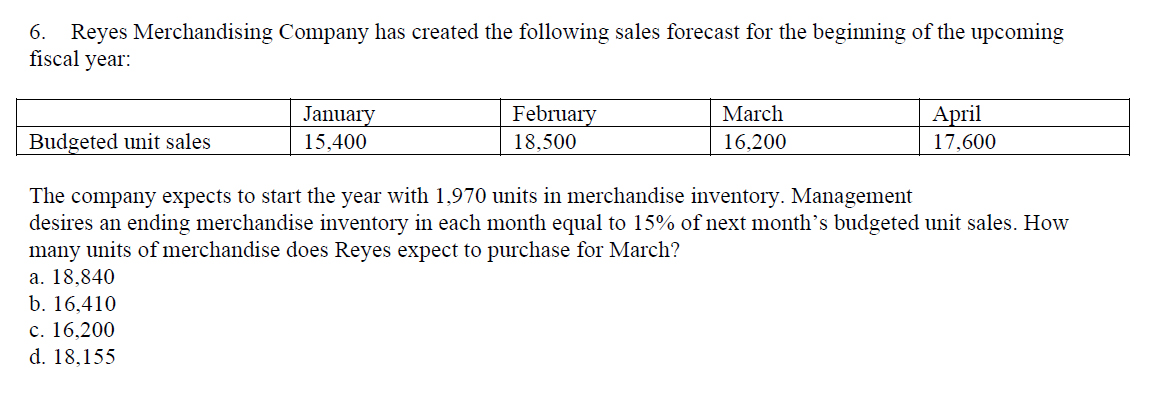 many units of merchandise does Reyes expect to purchase for March? a. 18,840 ’0. 16,410 c. 16,200 d. 18,155