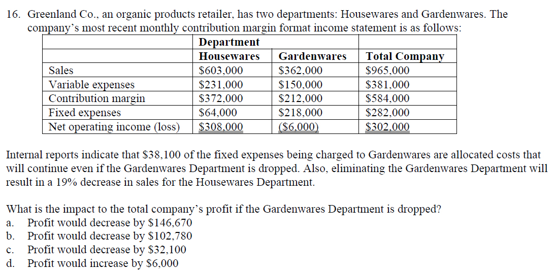 result in a 19% decrease in sales for the Housewares Department. What is the impact to the total company’s profit if the Gardenwares Department is dropped?