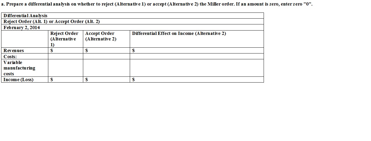 Decision on Accepting Additional Business Country Jeans Co. has an annual plant capacity of 64,400 units, and current production is 43,700 units. Monthly fixed costs are $39,500, and variable costs are $25 per unit. The present selling price is $38 per unit. On February 2, 2014, the company received an offer from Miller Company for 16,600 units of the product at $27 each. Miller Company will market the units in a foreign country under its own brand name. The additional business is not expected to affect the domestic selling price or quantity of sales of Country Jeans Co. A.Prepare a differential analysis on whether to reject (Alternative 1) or accept (Alternative 2) the Miller b. Having unused capacity available is Select relevant irrelevant Correct 1 of Item 2 to this decision. The differential revenue is Select more less Correct 2 of Item 2 than the differential cost. Thus, accepting this additional business will result in a net Select gain loss Correct 3 of Item 2. c. What is the minimum price per unit that would produce a positive contribution margin? Round your answer to two decimal places. $ ______________