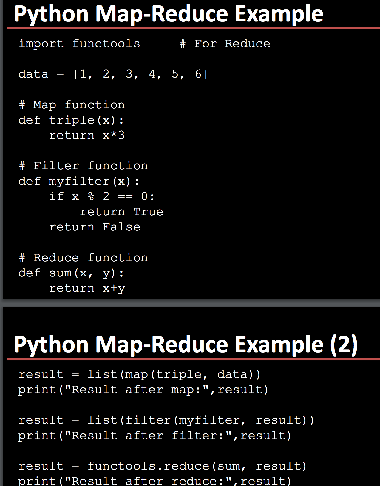 Create a Python program that uses Map-Reduce to analyze a data set. You must use map, filter, and reduce functions. Details: