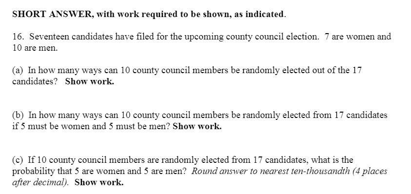 SHORT ANSWER, with work required to be shown, as indicated. 16. Seventeen candidates have filed for the upcoming county council election. 7 are women and 10 are men. (a) In how many ways can 10 county council members be randomly elected out of the 17 candidates? Show work. (b) In how many ways can 10 county council members be randomly elected from 17 candidates if 5 must be women and 5 must be men? Show work. (c) If 10 county council members are randomly elected from 17 candidates, what is the probability that 5 are women and 5 are men? Round answer to nearest ten-thousandth (4 places after decimal). Show work.Â