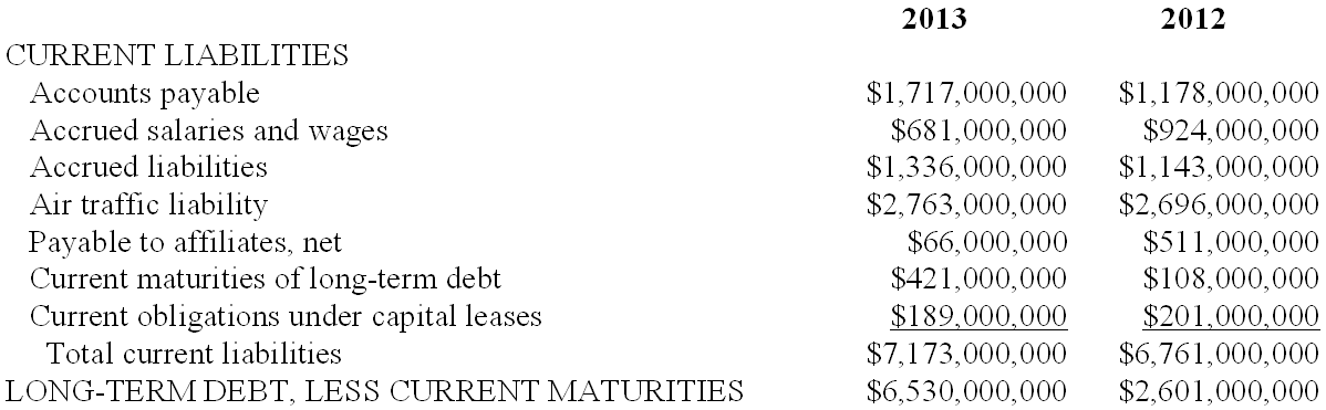 Question- In its 2013 annual report to shareholders, Border Airlines Inc. presented the following balance sheet information about its liabilities: Image In addition, Border presented the following among its note disclosures: Maturities of long-term debt (including sinking fund requirements) for the next five years are: 2014 - $421 million; 2015 - $212 million; 2016 - $273 million; 2017 - $1.0 billion; 2018 - $777 million. Required: Consider the appropriate classification of these long-term debt obligations. Assuming no more long-term debt will be issued, what are the implications of the information above for Border's liquidity and solvency risk in 2013 and the following years?