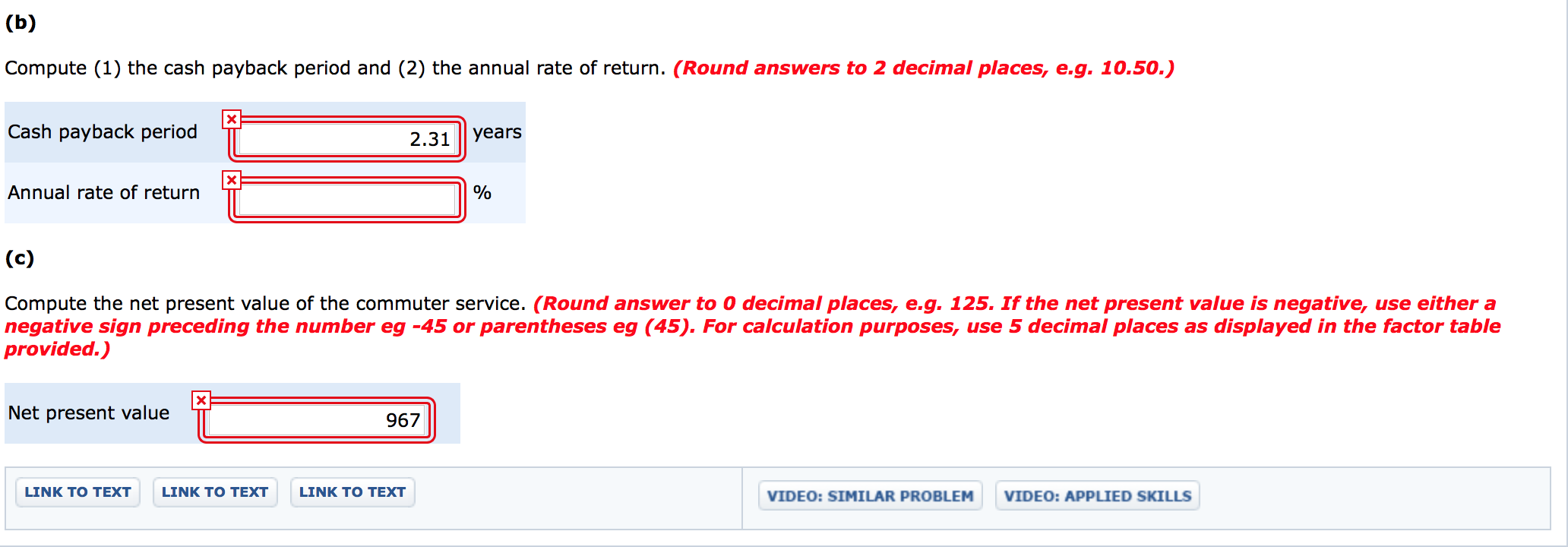 and each student will be charged $12.05 for a round-trip ticket. Click here to view PV table. (3) Determine the annual (1) net income and (2) net annual cash flows for the commuter service. (Round answers to 0 decimal places, e.g. 125.) Net income 7537 Net annual cash flows 32970 X $ X $