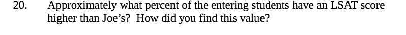 Approximately what percent of the entering students have an LSAT score higher than Joe’s? How did you find this value? This text was automatically generated from the attachment. Please refer to the attachment to view this question.