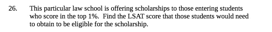 This particular law school is offering scholarships to those entering students who score in the top 1%. Find the LSAT score that those students would need to obtain to be eligible for the scholarship. This text was automatically generated from the attachment. Please refer to the attachment to view this question.Â