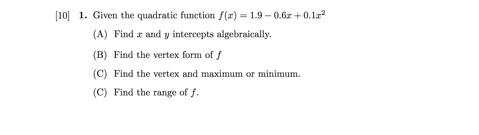 [10] 1. Given the quadratic function f (51:) = 1.9 — 0.651: + 0.151:2 (A) Find a: and y intercepts algebraically. B) Find the vertex form of f ( (C) Find the vertex and maximum or minimum. ( C) Find the range of f.Â