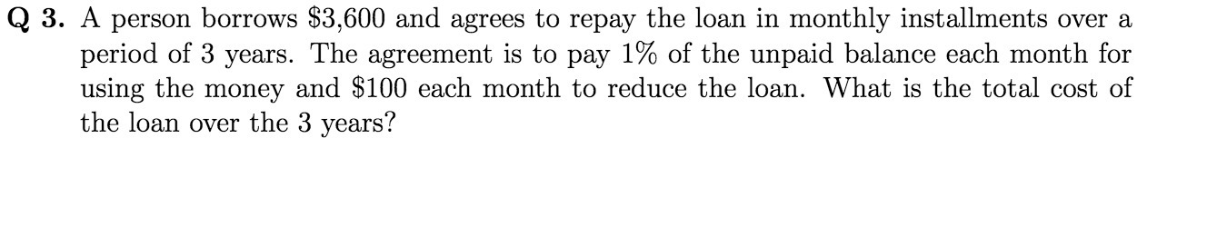 Q 3. A person borrows $3,600 and agrees to repay the loan in monthly installments over a period of 3 years. The agreement is to pay 1% of the unpaid balance each month for using the money and $100 each month to reduce the loan. What is the total cost of the loan over the 3 years?