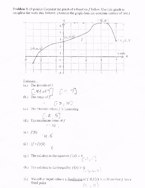 Problem 9. (9 points) Consider the graph ofa function f below. Use this graph to complete the work that follows. (Assume the graph does not continue outside of box.) ‘ / t ‘ ’5’; l . i ‘ | . t ‘ x-axxs I l r: I I I ; \ X 5 7 . _‘ . .._...__-- ‘L, t I l I 1,) - 3 Estimate... ((1.) (h) (d. j The domain of f Elk/#7:) I:’ 71 The range of f I F- 2 so I I .— The intervals where f is. incrcusing r- -- "y .‘i ‘ Z! £17 :1 'r' I l " . . The maxunum value at f x’. ’0 ‘(q'Jo/ (f‘°f3(0) fto) The solution to the equation ,1'{x) = U _ ‘ a L ’ ‘) “ o The SOlUllkll to the inequality ]’(x) > Q. We call an input \Iulue C a fixed point of f if f(C) fixed point. ’1‘ ,1 \ .I =: C. Show that f has a