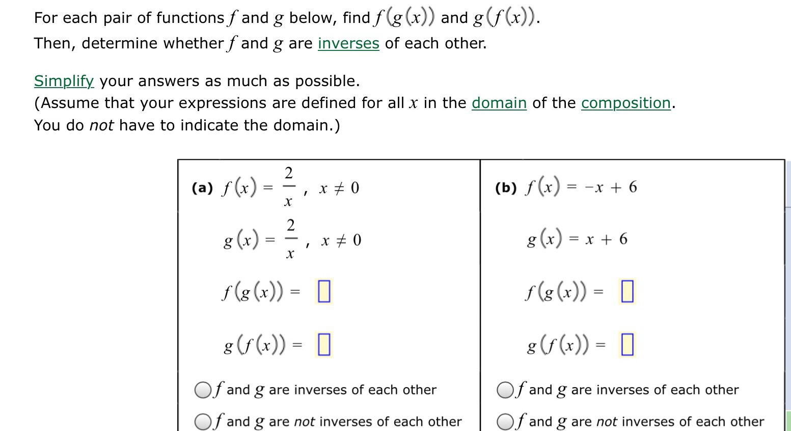 Then, determine whetherfand g are inverses of each other. Simm your answers as much as possible.