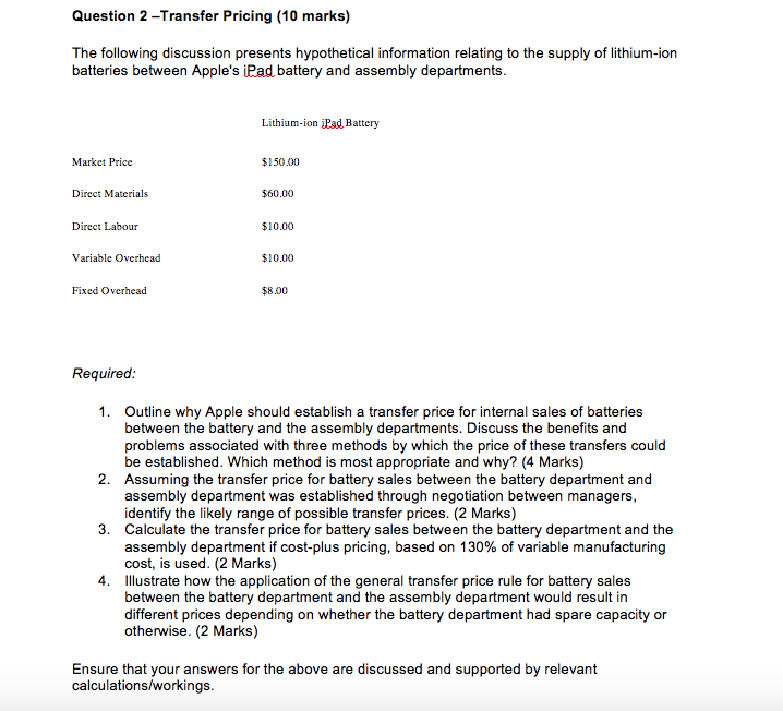 lIl-‘tuestlon 2 —Transfer Pricing {‘tltI marks} The following discussion presents hypothefical information relating to the supply of lithium—ion