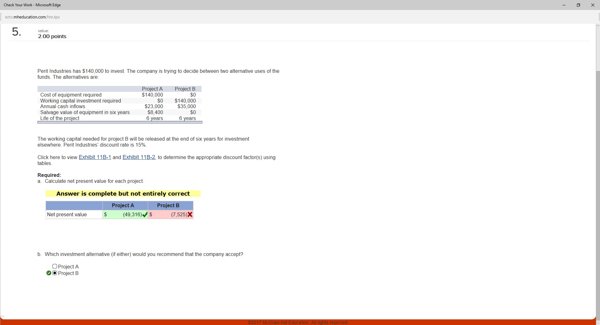 a Calculate net present value for each project, Answer is complete but not entirely correct Net present value 3 (49,316” b. Which investment alternative (ri either) would you recommend that the company accept? 0 Project A