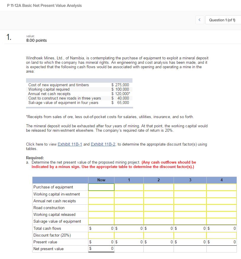 a Determine the net present value of the proposed mining project. (Any cash outflows should be