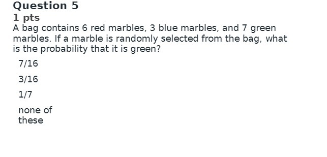Question 5 1 pts A bag contains 6 red marbles, 3 blue marbles, and 7 green marbles. If a marble is randomly selected from the bag, what is the probability that it is green? 7/16 3/16 1/7 none of theseÂ