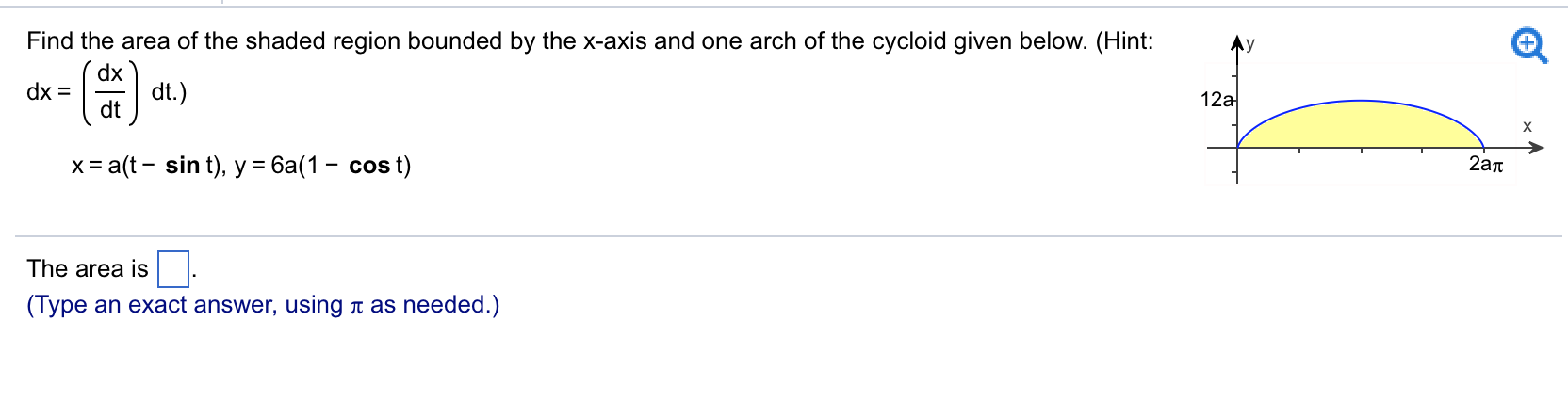 Find the area of the shaded region bounded by the x-axis and one arch of the cycloid given below. (Hint: _ dx