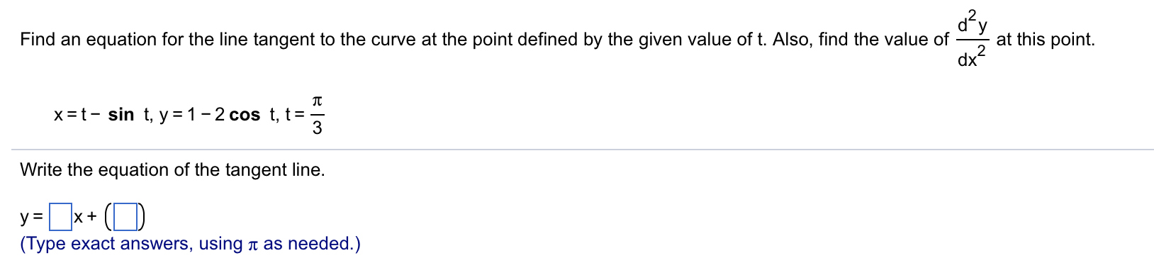 x=t- sin l,y=1-2cos t,t=§ Write the equation of the tangent line. FD“ (E) (Type exact answers, using a: as needed.)