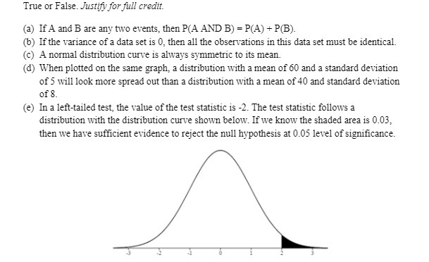 True or False. Justify for full credit. (a) If A and B are any two events, then P(A AND B) = P(A) + P(B). (b) If the variance of a data set is 0, then all the observations in this data set must be identical. (c) A normal distribution curve is always symmetric to its mean. (d) When plotted on the same graph, a distribution with a mean of 60 and a standard deviation of 5 will look more spread out than a distribution with a mean of 40 and standard deviation of 8. (e) In a left—tailed test, the value of the test statistic is —2. The test statistic follows a distribution with the distribution curve shown below. If we know the shaded area is 0.03, then we have sufficient evidence to reject the null hypothesis at 0.05 level of significance.