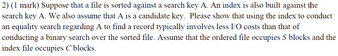 Suppose that a file is sorted against a search key A. An index is also built against the search key A. We also assume that A is a candidate key. Please show that using the index to conduct an equality search regarding A to find a record typically involves less I/O costs than that of conducting a binary search over the sorted file. Assume that the ordered file occupies ???? blocks and the index file occupies C blocks
