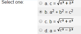 Which of the following is NOT a true equation for the PythagoreanTheorem, where c is the hypotenuse and a and b are the legs?
