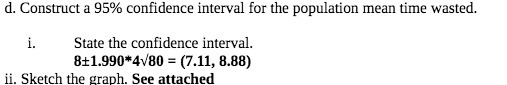 d. Construct a 95% confidence interval for the population mean time wasted. i. State the confidence interval. 8i1.990*4\/80 = (7.11, 8.88) ii. Sketch the graph. See attachedÂ